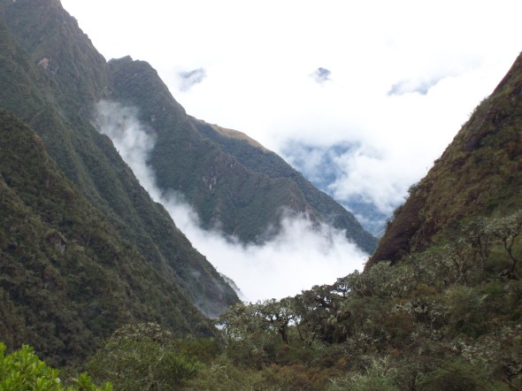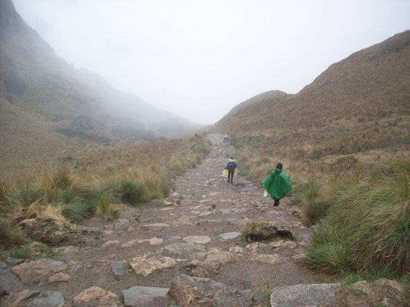 We were woken up at 5:00 in the morning by porters who knocked on our tent offering us coca tea. A more or less pleasant way to wake up in the mountains, I guess. Breakfast with pancakes, oatmeal, coffee, bread and butter – we could tell it was going to be a hard day. Hard doesn’t even begin to describe it. Day 2 was pretty much an uphill hike for about 5 hours, then down another 2 hours until we reached the campsite for lunch. Going up an endless mountain on steep stone stairs is one of the most hellish things one can think of doing. Throw in the cold and rain and it just makes you want to throw yourself off the side of the mountain. Equally discouraging are the porters who zoom past you with a house on their back.
