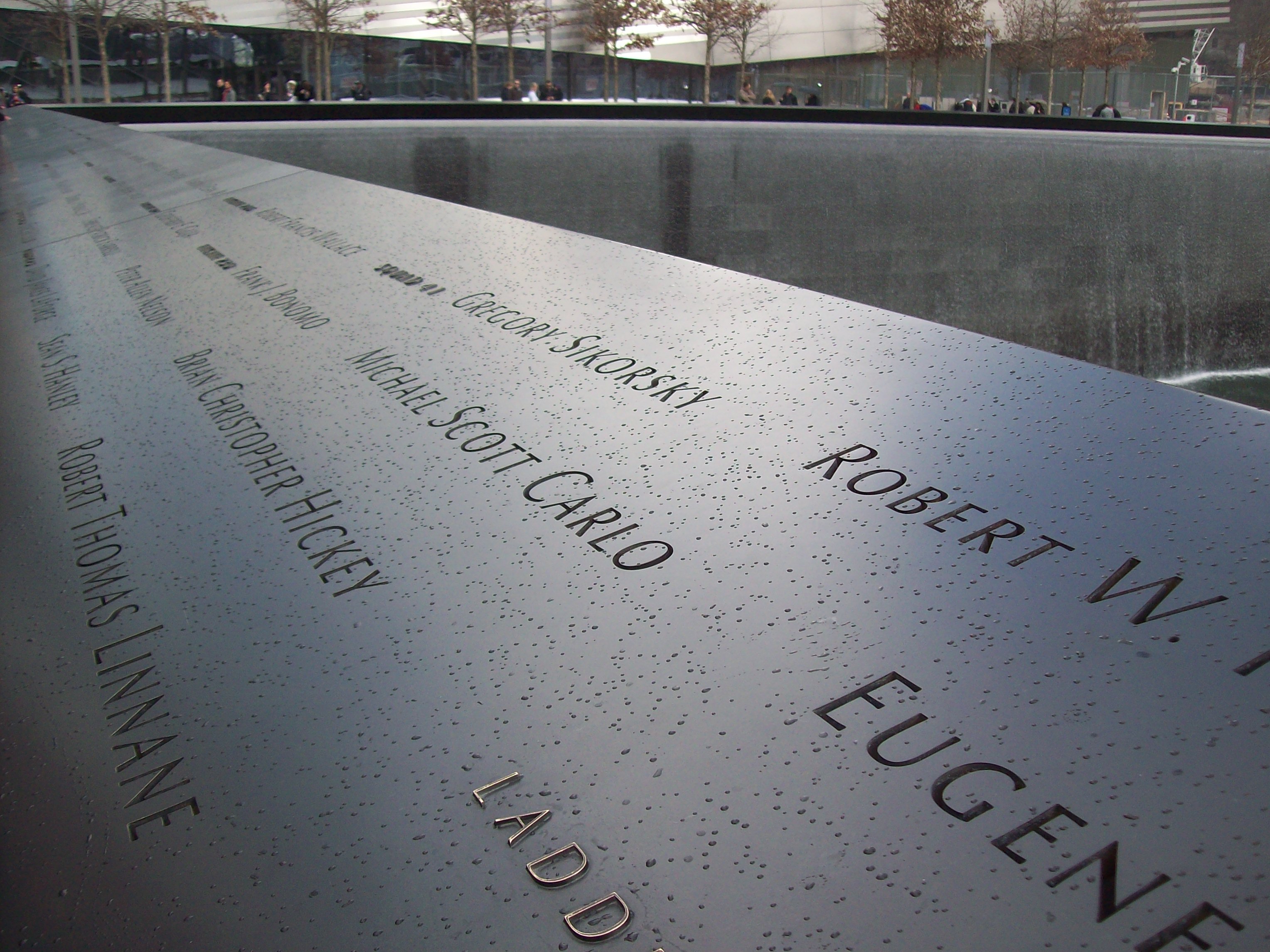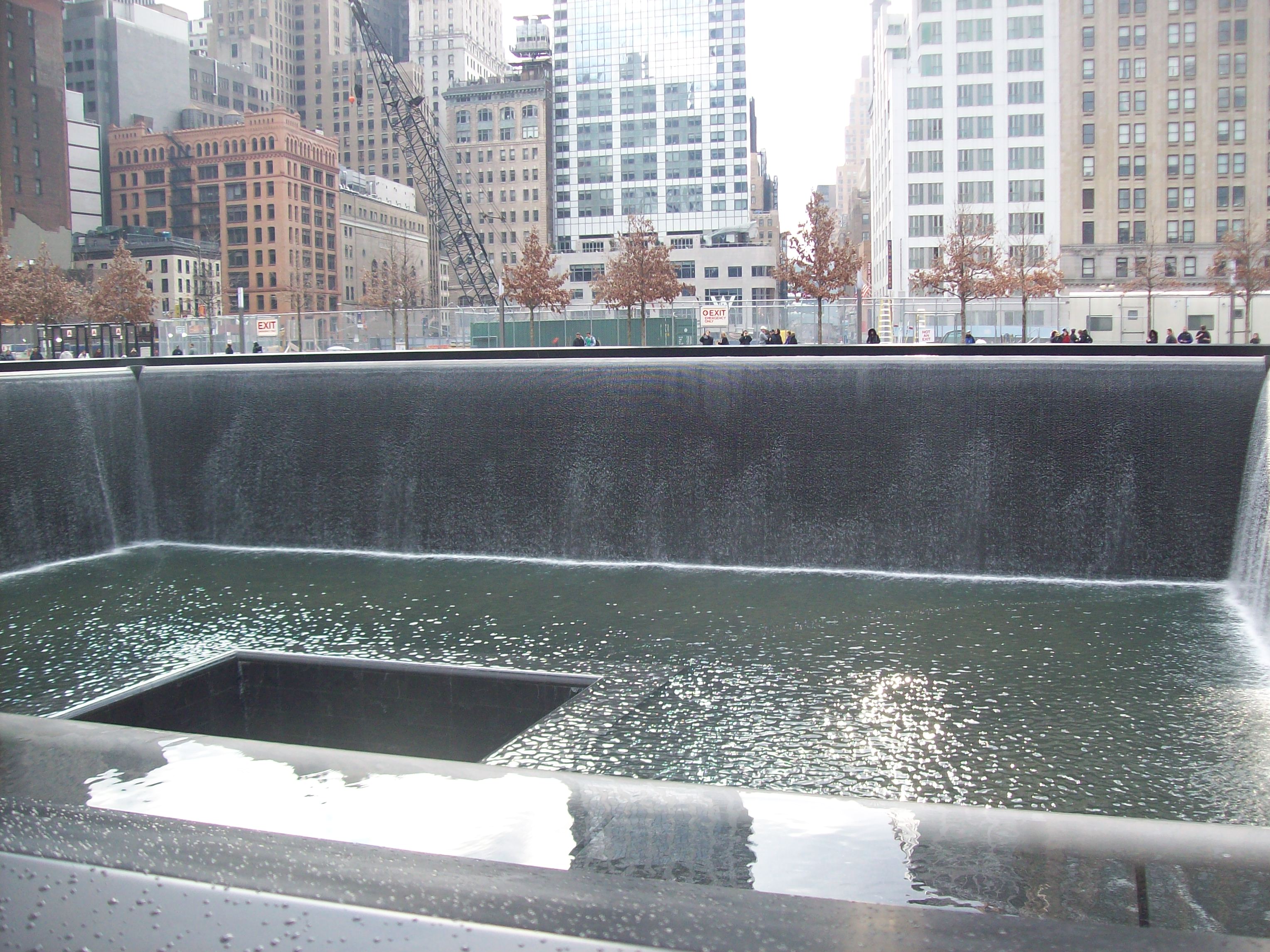 Inside the memorial, which consists of two huge steel pools where the blueprint of the two WTC buildings used to be. Water falls continuously from all four sides of the pool in thin sheets onto a shallow pool floor, only to fall into an abyss-like hole in the very middle of the structure, whose depths are impossible to gauge. Inscribed in steel all along the sides of each pool are the names of those who died that day.