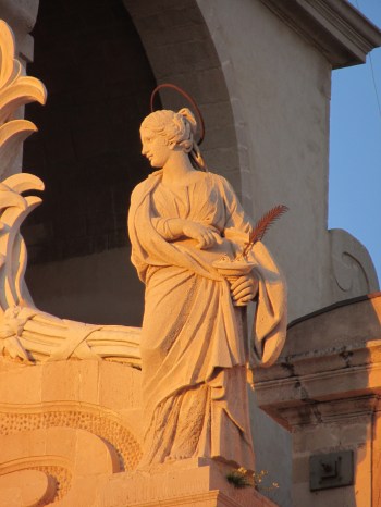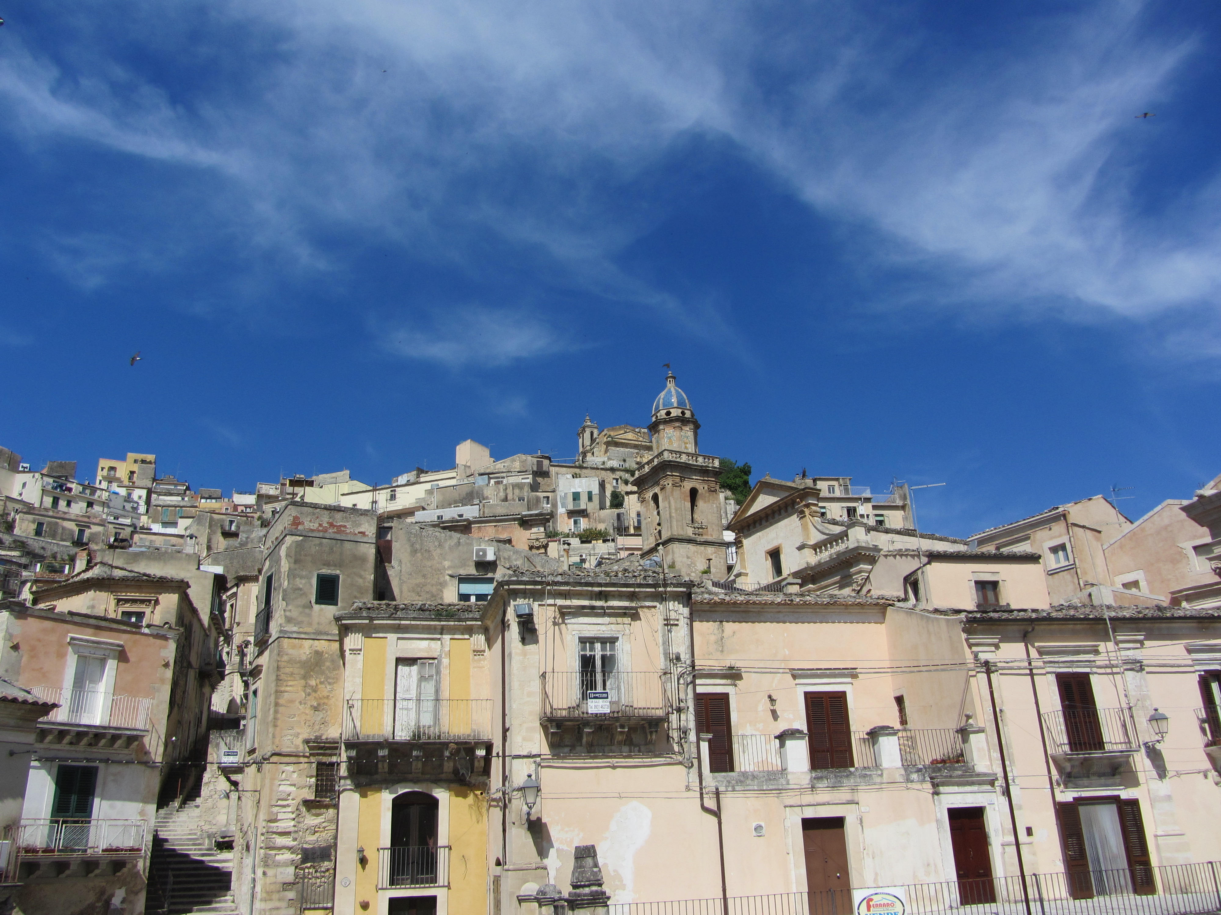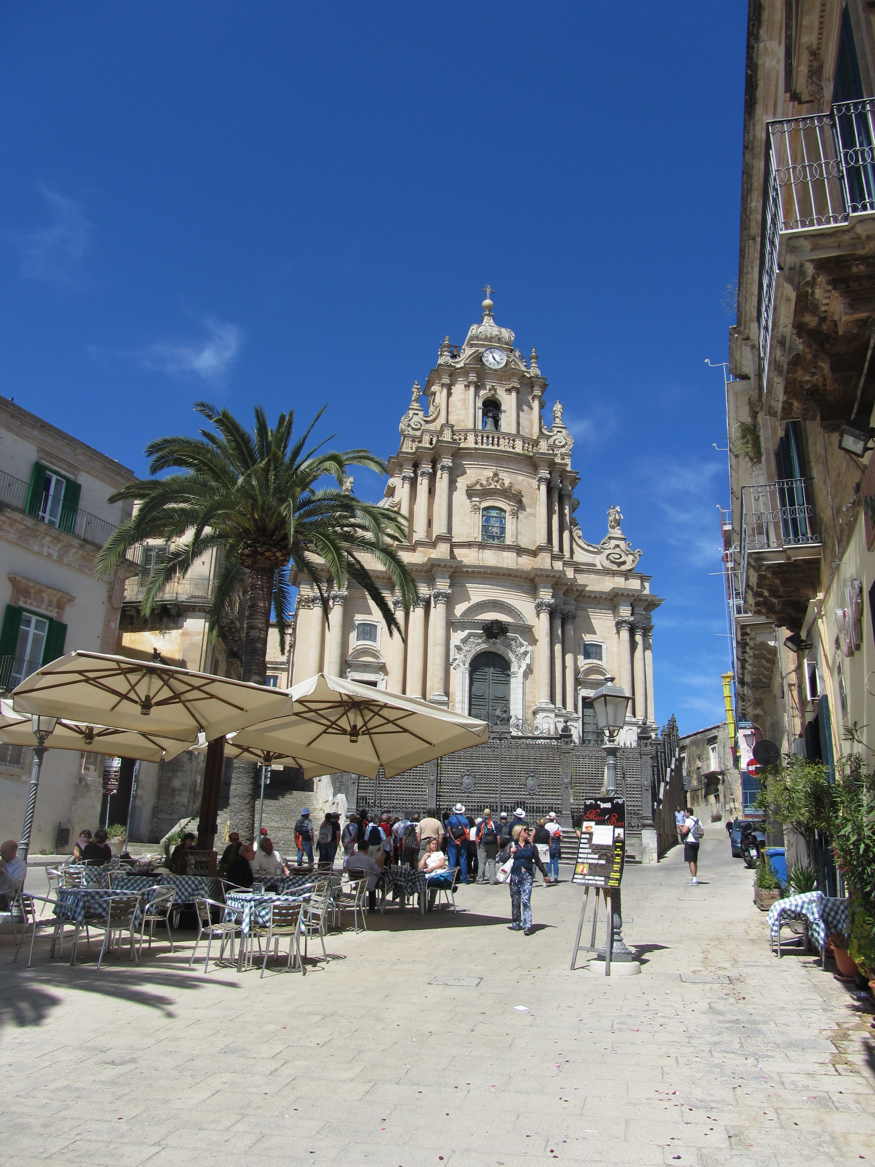 In a tour through the old medieval town, the churches take center place, rising up two, three stories in the middle of white plazas, churches reminiscent of colonial Spain and Portugal. Up and down steps in the midday heat, through palace gardens, relishing views of the houses in Ragusa.