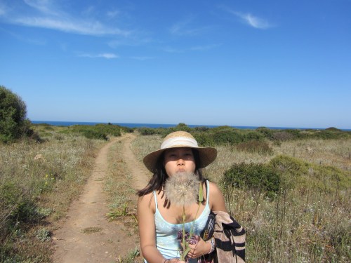 I wish we had time to hike the entire 7 kilometers and back — a day’s trek. Flowers peek from the brushes and the cool salt breeze threatens to send my hat flying. Walking on a silent road in a foreign place between mountains and sea is one of the best ways to let go of one’s self.