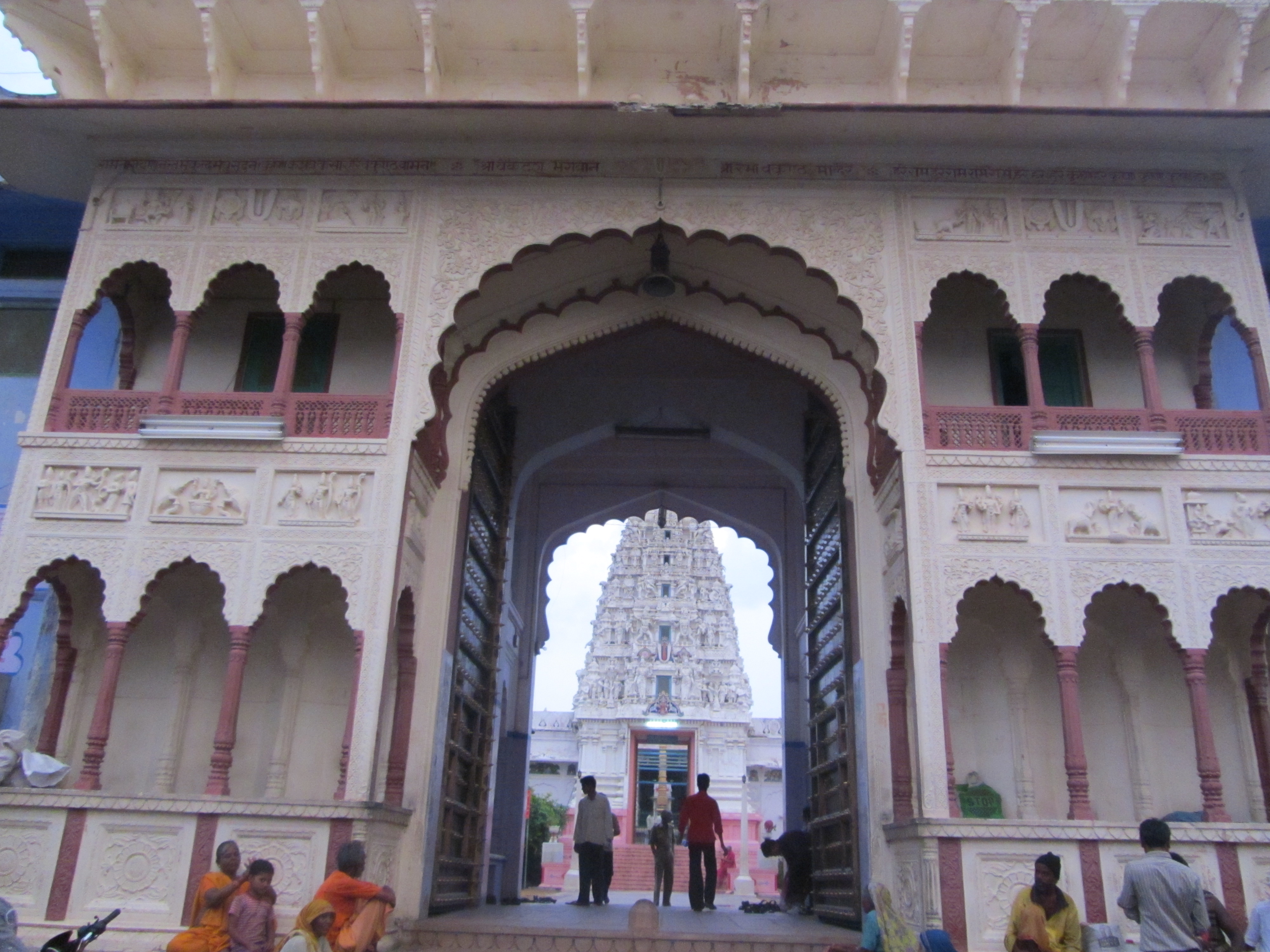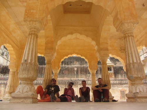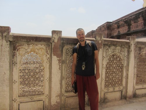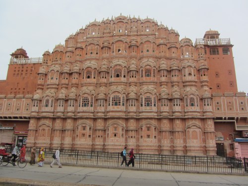 We visit the other interesting sites in Jaipur — Royal Albert Hall, the astrological observatory Jantar Mantar, and the wind palace Hawa Mahal. We visit the shops, are persuaded into buying rugs, ruby and sapphire necklaces, cashmere sweaters. Salesmen. All the buildings in the city are of pink stone; they look kind of like beehives, like ancient structures inhabited by shops, tourists, the homeless.