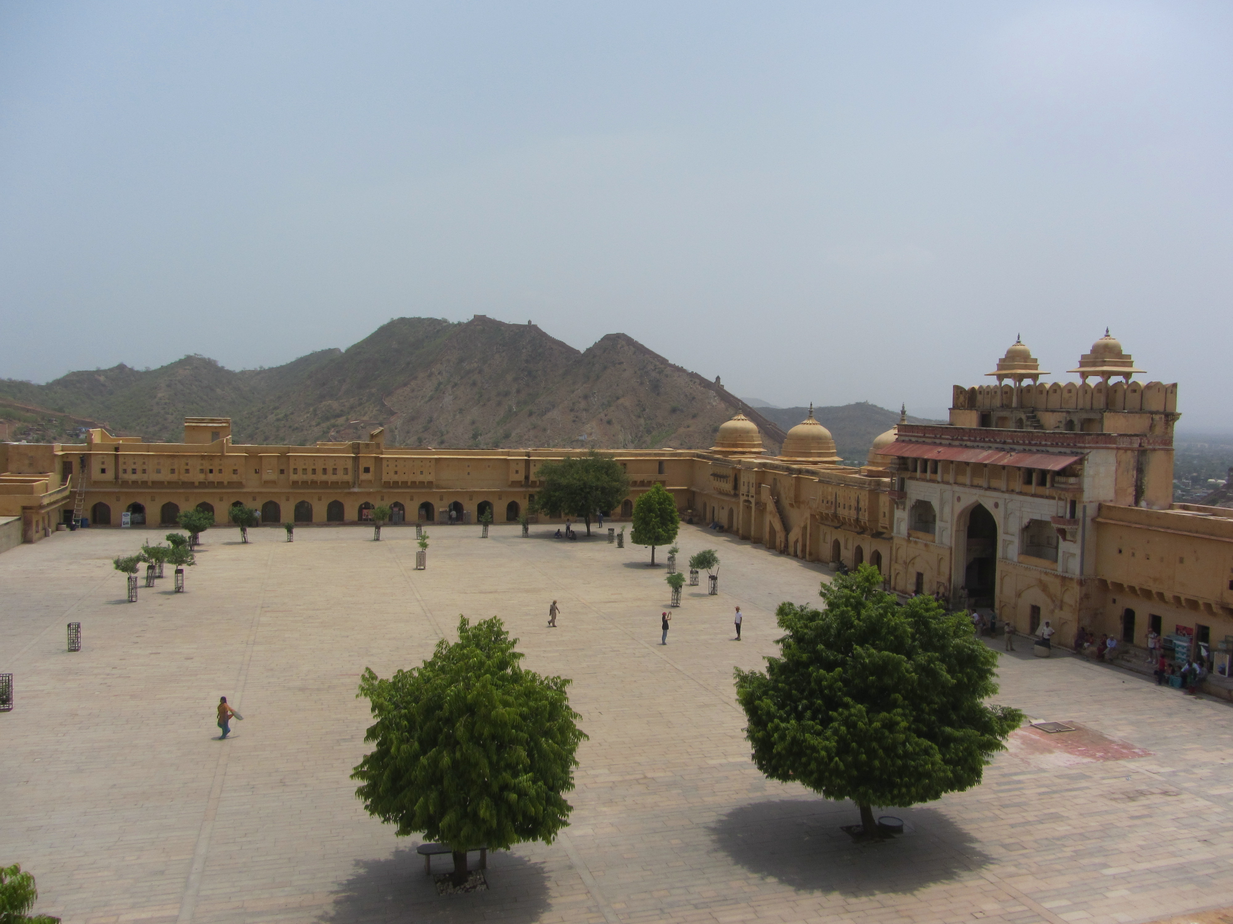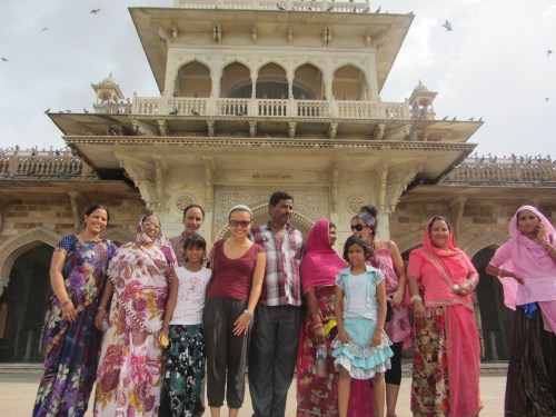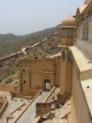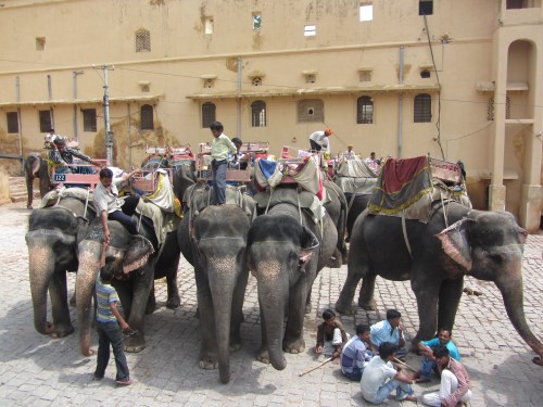 Jaipur is known for its Amber Fort, a huge, pinkish-yellow castle rebuilt by the Maharajas of the 16th century. We ride up the steep slopes by elephant — they are magnificent, so majestic yet timid-looking with their long lashes, beautifully painted from forehead to trunk. I feel absolutely like a queen on the cushioned “howdah,” moving up and down with the elephant’s slow gait, observing the view of the gardens and the surrounding wall, which looks a bit like the Great Wall of China. The elephants take us into the courtyard of the palace. It’s beautiful, reminiscent of the Alhambra but not so sumptuously decorated. The harsh, hot conditions of the area make the palace seem wilder, with rougher edges; the winds and rain have made the stone sparer. Our guide points out Islamic influences — the 6-pointed star, the scalloped arches. Everything is a sand-colored splendor, a palace in the desert, armored against the heat by stone canopies, painstakingly shaped window formations through which air passes and cools, handicrafted silk screens dampened with water.