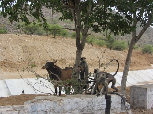 On the road again, making a pitstop in Pushkar. On the way to Jodhpur, Prem tells me a bunch of animal riddles. I didn’t know that peacocks, the national bird of India, became pregnant by drinking the tears of the males during monsoon season. The only animal to do so. The long dirt road flanked by dry farmland and prairies is reminiscent of some backwoods safari, with few animals — dogs, snakes, squirrels, birds, monkeys, cows as always. Cows everywhere, lying in the middle of big roads with heavy traffic, meandering calmly from lane to lane as cars swerve left and right. Cows, skinny, sickly cows eating out of piles of trash along with the dogs. Crows perch in trees, patches of rice grow in the paddies. Women, heavily decorated with silver on their arms, balance gourds on their heads or stand in groups chatting.