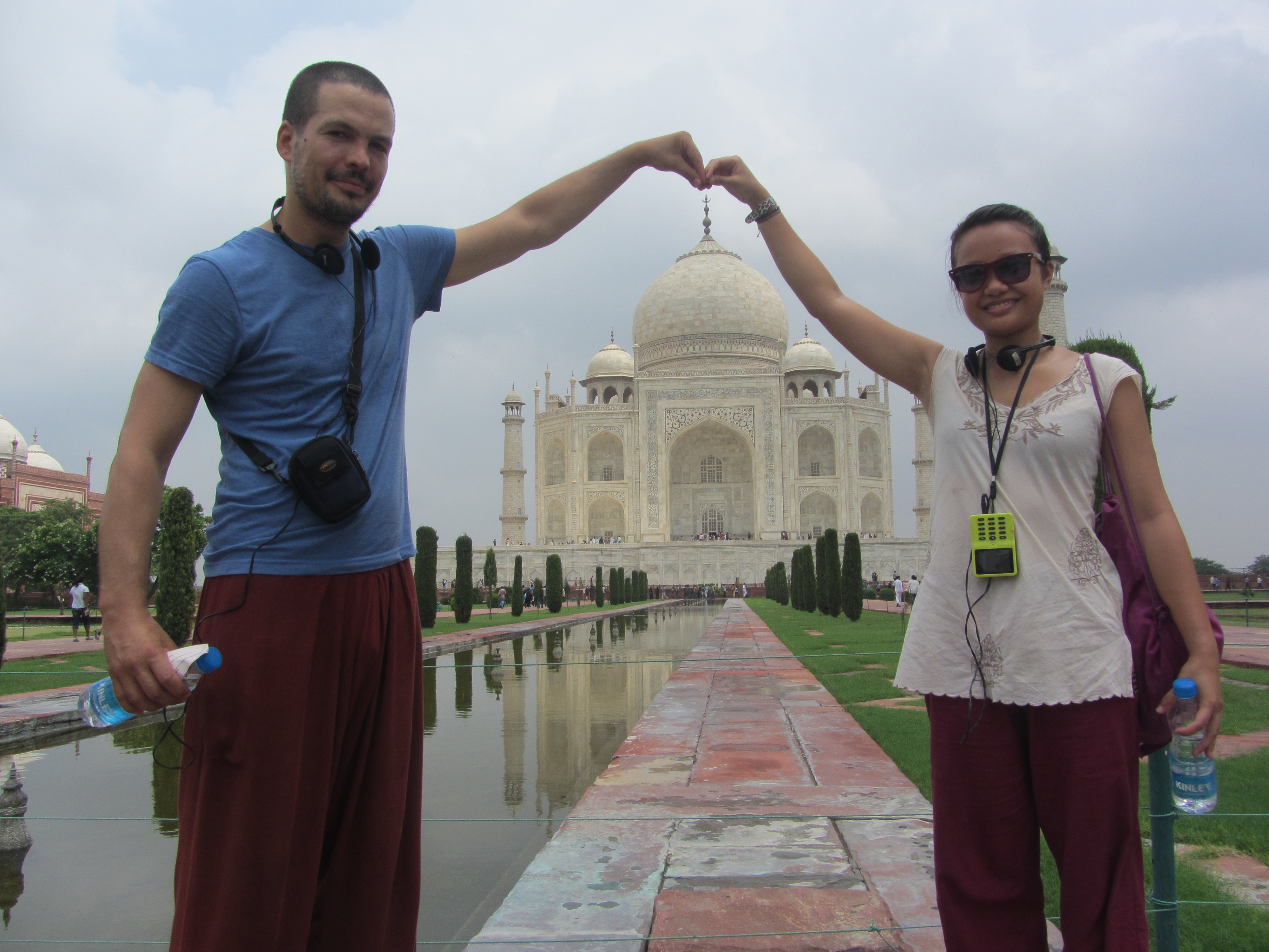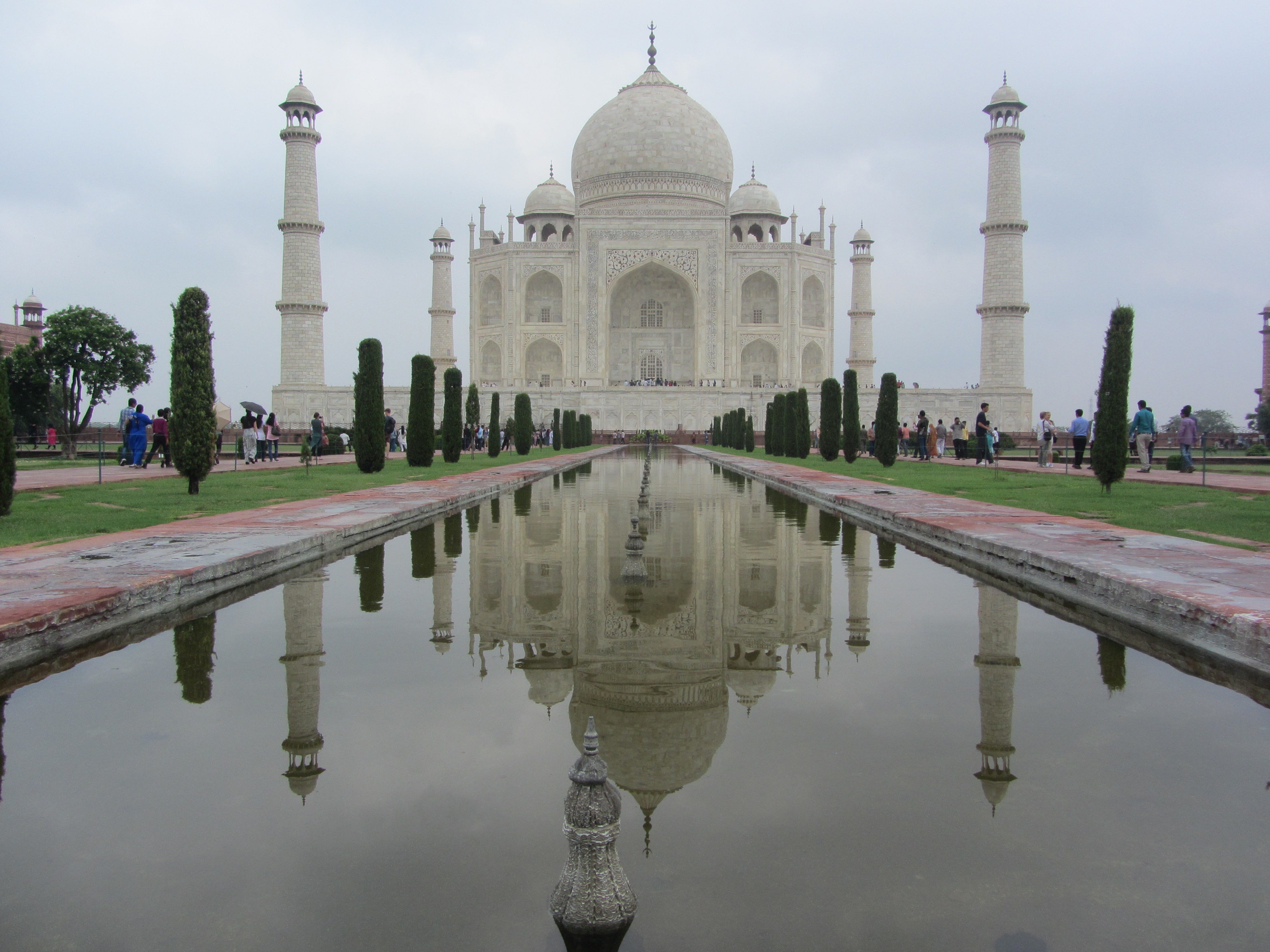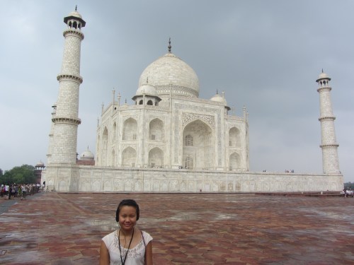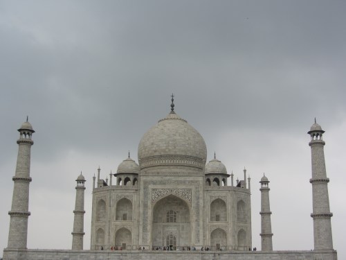 The Taj Mahal. I never knew it was a mausoleum. The Mughal emperor Shah Jahan dedicated it to his beloved wife after she died giving birth to their 14th child. Huge, white, ornate, and astonishingly beautiful, much more stately and solemn than I had imagined (not at all like the gold-topped, shiny, tacky Las Vegas image). Against the sky, the river behind it, it is so brilliant, a color reserved only for paintings of heaven, or clouds. I imagined a lush, luminous palace for sultans when inside, there are only two sarcophagi resting on marble — the entire building is a mighty tomb of marble. There is an air of tragedy immortalized; you see that structure and can only begin to imagine the heart which was moved to build something like that, to die in it alongside his wife. One of the seven wonders of the world.