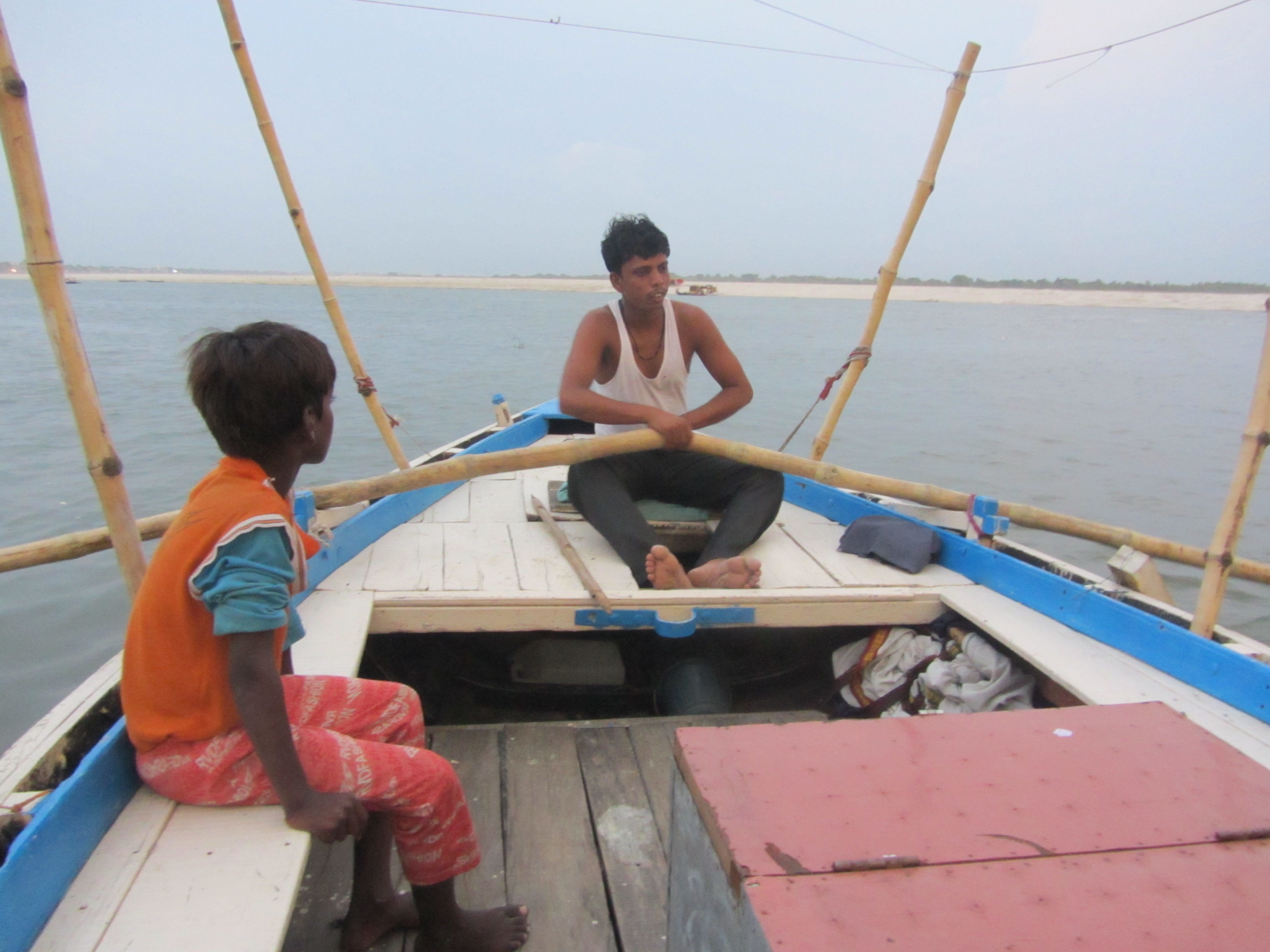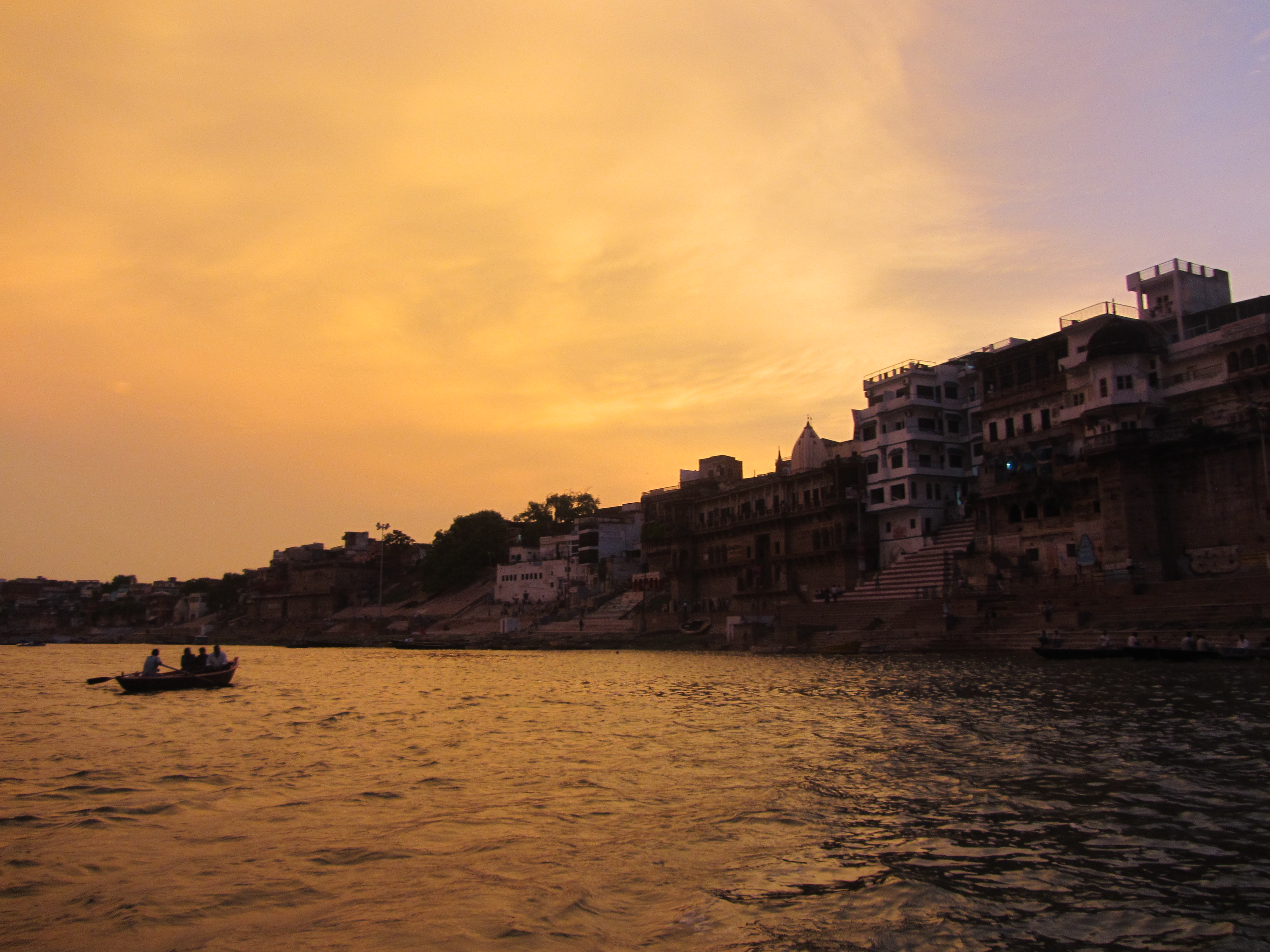 An evening boat ride. We catch a glimpse of a ceremony happening. Men splash about in the river, bathing themselves, cooling down in the nighttime waters. The boatman laboriously rows, the long bamboo-like rowers creaking with each effort. It is difficult to row upstream, with the strong currents. That’s the only sound up close, the creaking, the movement of water, then from afar, the splashing of the men, the prayer ceremony beginning. A 10-year-old boy with a timid, dream-like faces sits near the boatman in silence, looking towards us from time to time. All these quiet souls on the boat on a ride which seems timeless, not endless, but outside of time, as if we will never age, as if we really are centuries old already and are still rowing. I don’t want to be just a tourist, someone who is being ferried from one shore to another. I think about what the boy will look like years from now, if he will remember this boat ride — if he remembers any boat ride with foreign strangers. I wonder what he is thinking, as he dutifully, silently steers the boat, I wonder if he’d rather be playing than sitting on this boat with us, how much of his childhood has already been taken from him. We say hello, ask his name. A flicker of a smile brightens his doe-like face, then disappears as he looks with ancient eyes towards the water. The multitude of people which you come across while traveling, but really never know. It is sad, this grazing nearness of souls so different from one another, this awful dependence, temporary relationships based on money, on need. Their insistence has nothing to do with friendliness, or curiosity, or kindness — it is driven only by money. You wish you could go closer, speak to them and have them speak to you as a real person. You wish this boat ride meant more than just a dinky boat ride on the Ganges. You wish the boy and the boatman didn’t have to be on that boat, so solemn, silent, and indifferent to your presence. You wish somehow you could change the world, starting with India.
