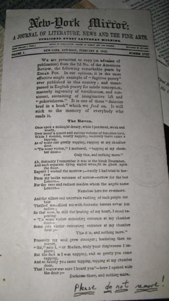And that is us sitting in a drawing room decorated to Poe’s taste (lots of red and gold trim, portraits of pale women) and listening to “The Raven” while perusing through old copies of his works. Check out an audio recording of Anne Waldman reading the “The Raven” over at Poets.org. Also check out Aimee Nezhukumatathil’s essay on Linda Pastan’s poem, “The Deathwatch Beetle,” where she discusses how the ticking sounds in Poe’s “The Tell-tale Heart” echoes the theme of mortality throughout the eerie poem.