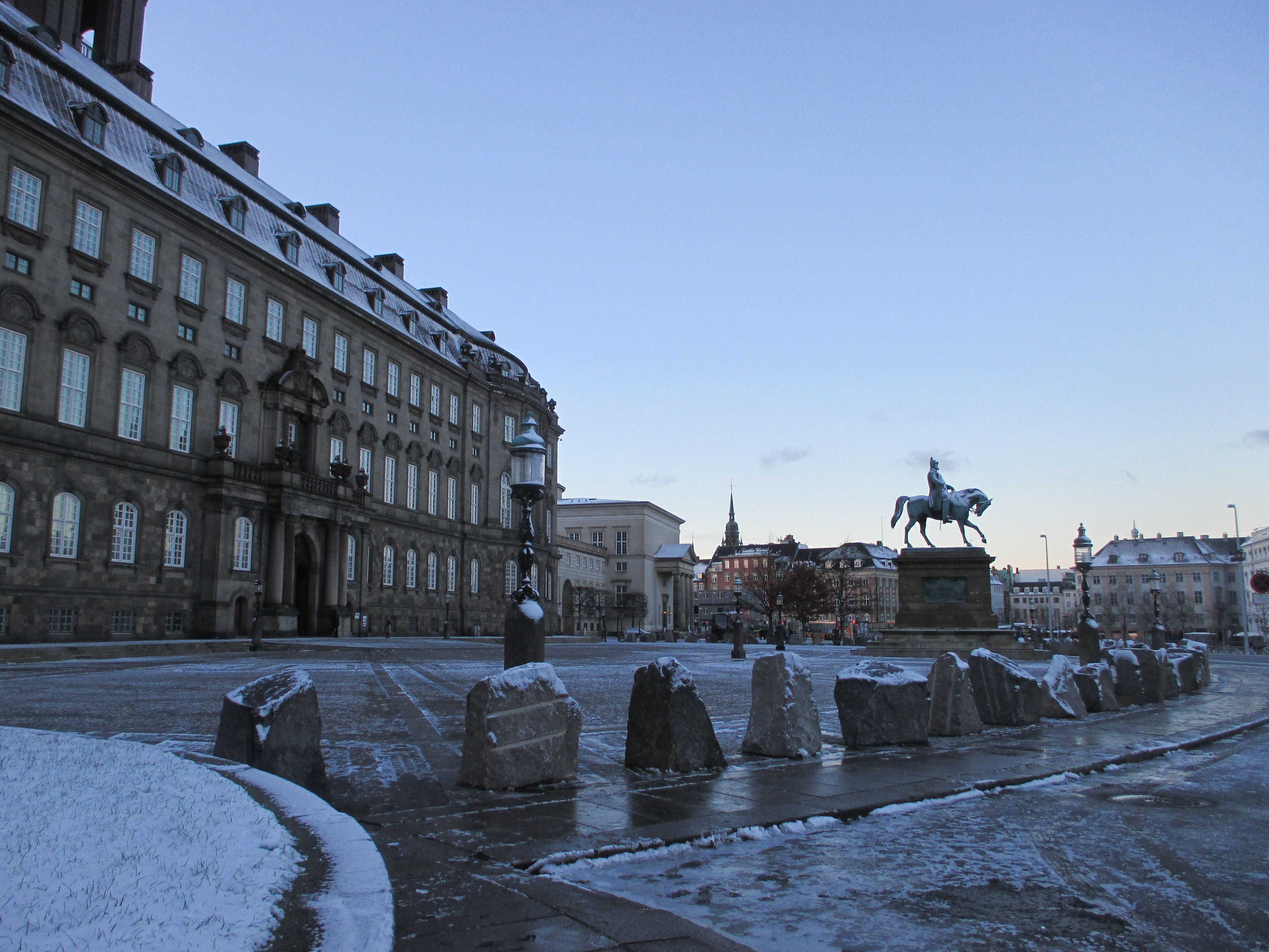 A chilly walk through the area of the Christianborg castle. Quiet snow lays on cobblestoned streets within the castle complex. It is Christmas Eve and the late sun is making its way down below the slanted roofs of the buildings and between the colorful canals.